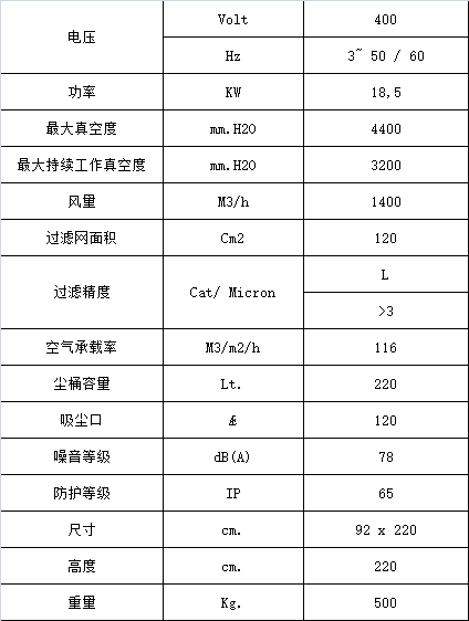 吸尘系统是旁路马达,由风扇和马达轴直联而成,无传输装置,因此完全免维修,适应于24小时高强度作业,操作时噪音低,性能优 。当机器过热时会自动切断电源,停止工作。控制板设在机器的后面,有ON和OFF开关(IP65),一个紧急关闭开关和软开启按钮。真空指示器会不停地监视吸尘过程,避免堵塞或异常。同时泄压阀保护马达避免因滤袋堵塞或其他吸尘系统的破损而造成的过热。出风口处的滤袋减少流出气体的噪音并达到降速。配备远程遥控开关,便于集尘系统高效开始/关闭。