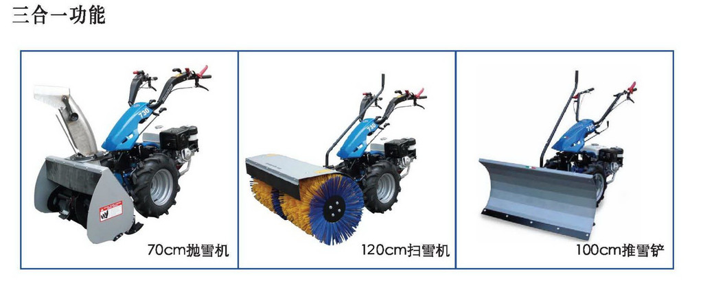 7.通用性,机器可以一机多用,即:一台主机可以更换扫雪滚刷、除草、旋耕、开沟、雪铲、抛雪等数十种以上的辅具头。
